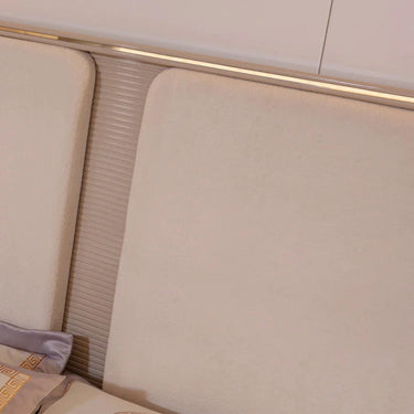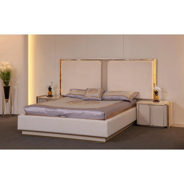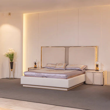 A Galaxy ágy a modern elegancia és a luxus kényelmének kifinomult megtestesítője. Prémium anyagokból készült, így hosszú élettartamot és maximális komfortot biztosít. A bézs kárpitozás és az aranyszínű részletek elegáns, exkluzív megjelenést adnak a hálószobának. A párnázott fejtámla nemcsak stílusos, hanem kényelmes háttámaszt is nyújt olvasás vagy pihenés közben. A Galaxy ágyméreti : szélesség 217 cm, magasság 39 cm, mélység 180 cm, míg a fejtámla mérete 242 cm széles, 145 cm magas és 10 cm mély.