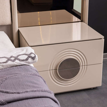 A Panamera éjjeliszekrény elegáns és praktikus kiegészítője a hálószobának. Letisztult formavilágával és bézs színével harmonikusan illeszkedik bármilyen enteriőrbe, miközben funkcionalitásával kényelmes tárolási lehetőséget biztosít. A beépített LED világítás nemcsak modern megjelenést kölcsönöz, hanem kellemes, hangulatos fényt is biztosít az esti órákban. Ideális választás azok számára, akik stílusos és időtálló bútordarabot keresnek a franciaágy mellé.