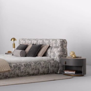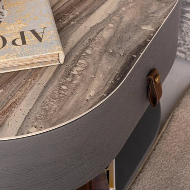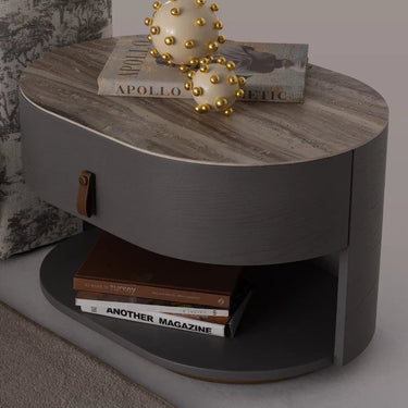 A ZEN éjjeliszekrény egy kompakt, mégis rendkívül kifinomult hálószobai darab, amely funkcionális kialakításával és igényes anyaghasználatával tűnik ki. A korpusz ívelt, ovális formájú MDF szerkezet, amely természetes nyírfurnér borítással és matt, antracit színű pórusnyitott festéssel készül. A fiókelőlap valódi diófurnéros felületű, kézzel felvarrt bőrfogantyúval ellátva, míg a felső lap mart, faerezett strukturálású HPL borítást kapott a hosszabb élettartam érdekében. A fiók push-open vagy soft-close mechanikával is rendelhető. Az alsó nyitott rekesz további tárolási lehetőséget biztosít, a bútor teljes egésze pedig egy finoman megemelt, arany tónusú, porfestett fémtalapzaton nyugszik. A ZEN kollekció részeként harmonikusan illeszkedik a kárpitozott ágy mellé, stílusos, időtálló kiegészítőként.