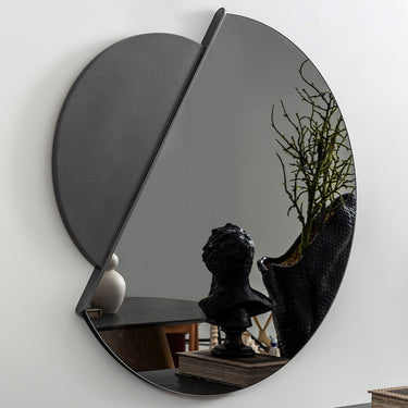 Ez a különleges, geometrikus formavilágú fekete tükör a modern enteriőrök elegáns középpontja lehet. A tükör aszimmetrikus, félkör alakú kialakítása minimalista, mégis karakteres megjelenést kölcsönöz a térnek. A matt fekete fém keret finoman ellensúlyozza a fényes tükörfelületet, így harmonikus egyensúlyt teremt. Ideális választás nappalikba, előszobákba vagy hálószobákba, ahol stílusos kiegészítőként funkcionál. A tükör nemcsak dekoratív, hanem optikailag tágítja is a teret, több fényt és mélységet kölcsönözve a helyiségnek. Kézműves jellegű kidolgozása prémium minőséget sugároz. Modern bútorok, fekete dísztárgyak és természetes anyagok mellé különösen jól illeszkedik. Ez a design tükör egyszerre művészi alkotás és praktikus lakberendezési elem.