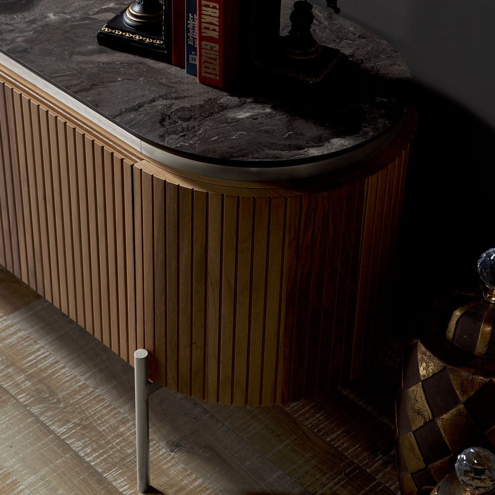 A TESLA TV-szekrény modern, elegáns és minimalista designjával bármely nappali központi eleme lehet. A természetes fa textúráját hangsúlyozó függőleges lamellás frontok, illetve a lekerekített oldalsó ívek karakteres, mégis finom megjelenést biztosítanak. A felső lap többféle kivitelben rendelhető, így tökéletesen illeszthető a modern, klasszikus vagy eklektikus enteriőrök stílusához.