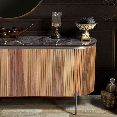 A szekrény alsó fém lábazata stabil alapot ad, miközben könnyed, lebegő hatást kelt. A fémelemek arany, ezüst vagy bronz tónusban választhatók, így a bútor könnyedén összhangba hozható a lakás egyéb részleteivel, például a lámpatestekkel, fogantyúkkal vagy kiegészítőkkel.