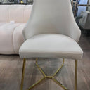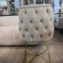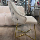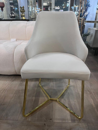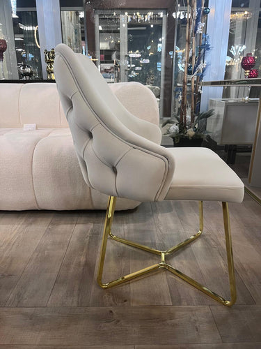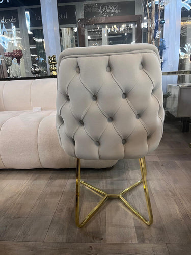 Az Alex szék a klasszikus eleganciát ötvözi a kortárs design letisztult formavilágával. Kárpitozott, bézs bársony felülete puha tapintású és luxus megjelenést biztosít bármely enteriőrben. A háttámla mély gombdíszítése és ívelt formája nemcsak vizuálisan hatásos, hanem maximális kényelmet is nyújt hosszabb ülés közben. Fényes, krómozott acélváza stabil alapot ad, miközben a kecses X-lábkialakítás könnyedséget és modern karaktert kölcsönöz a darabnak.