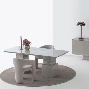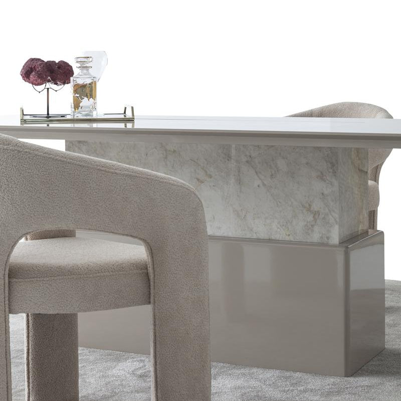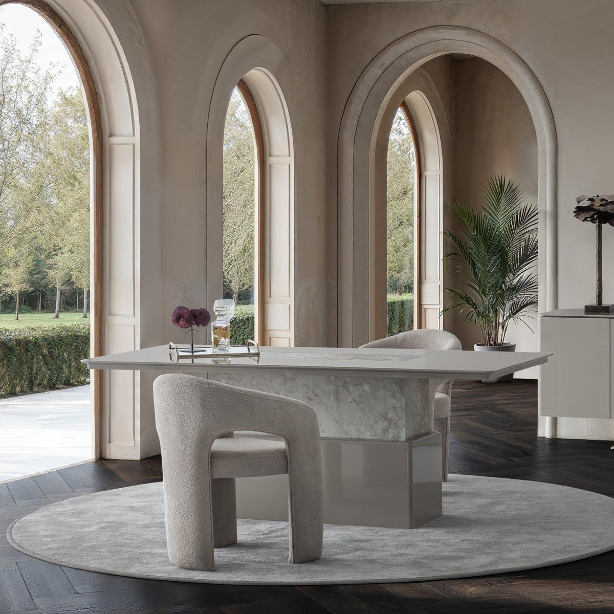 Az Aventador étkezőasztal a modern elegancia és a szoborszerű formatervezés tökéletes egyensúlyát képviseli. A masszív, geometrikus talapzat és a letisztult asztallap vizuálisan is erőt sugárzó kompozíciót alkot. Prémium minőségű, márványhatású felülete időtálló esztétikát biztosít, miközben exkluzív központi elemmé válik az étkezőben. A harmonikus, világos tónusok légies, nyugodt atmoszférát teremtenek a térben. Stabil szerkezete megbízható tartást nyújt, így nagyobb családi eseményekhez és mindennapi használathoz egyaránt ideális. A finoman megmunkált élek és a precíz illesztések magas szintű gyártói minőségről árulkodnak. Modern enteriőrökben tökéletesen érvényesül minimalizmusra épülő formavilága. Az Aventador étkezőasztal azoknak szól, akik egy igazán karakteres, luxus megjelenésű központi bútordarabot keresnek.