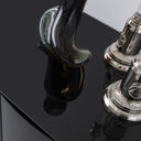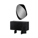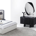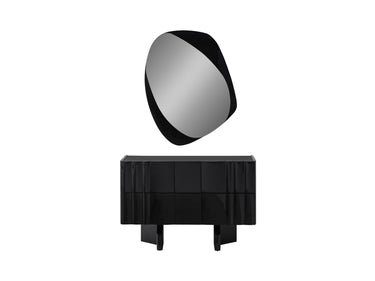 A Flow fényes fekete kifinomult formavilágot képvisel, amely egyszerre modern és elegánsan nőies. A sötét felület és az üveg asztallap egyedi, luxust sugárzó kompozíciót alkot. Tágas fiókrendszere kényelmes tárolást biztosít a mindennapi szépségápolási eszközöknek. A lekerekített tükör karakteres kiegészítő, amely vizuálisan lágyítja a bútor geometrikus formáit. A magas minőségű tükröződő felület torzításmentes és tartós használatra készült. A komód kompakt méreteinek köszönhetően kis és nagy hálószobákban, étkezőben is egyaránt praktikus választás. A kollekció többi elemével összhangban elegáns, egységes belső teret teremt. A Flow komód azoknak szól, akik szeretik a kifinomult, modern luxust.