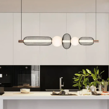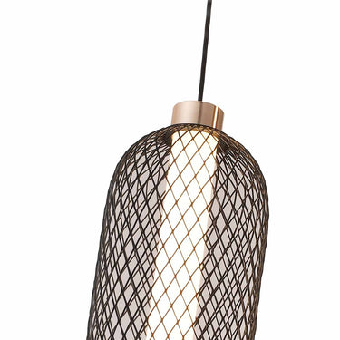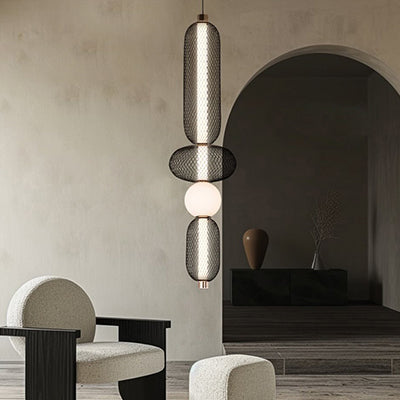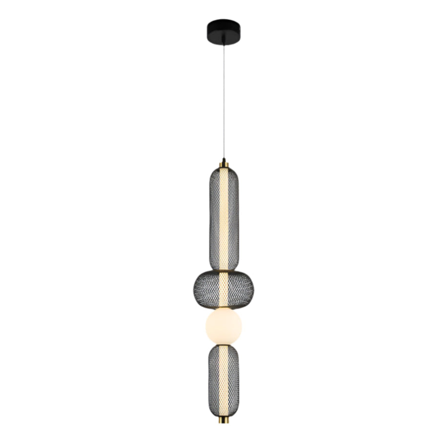 A Mesh Totem 1 égős függőlámpa a modern ipari design és a kifinomult glamour találkozása. A hosszúkás, fekete fémhálós burkolat finoman áttöri a fényt, míg az alsó opálüveg gömb meleg ragyogással tölti meg a teret. Letisztult formája mégis különleges, így kiválóan illik elegáns nappalikba, étkezőkbe vagy akár egy stílusos előszobába is.