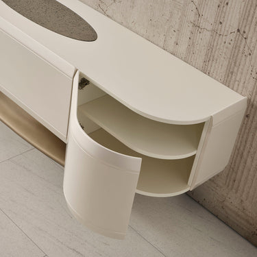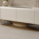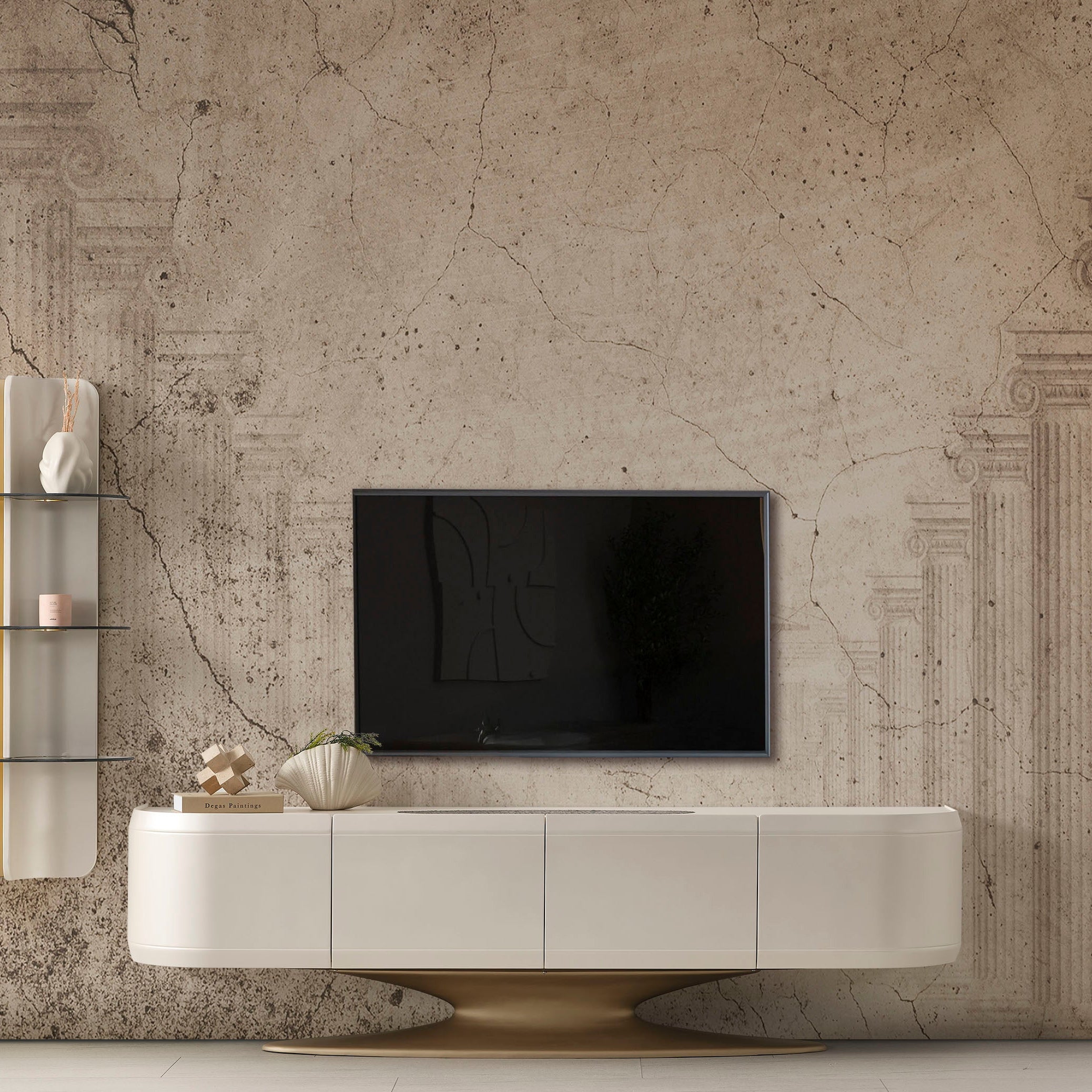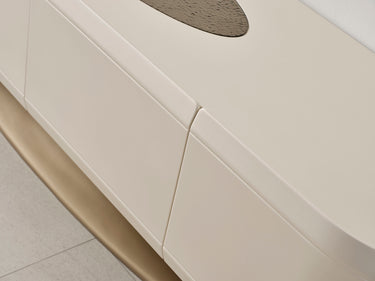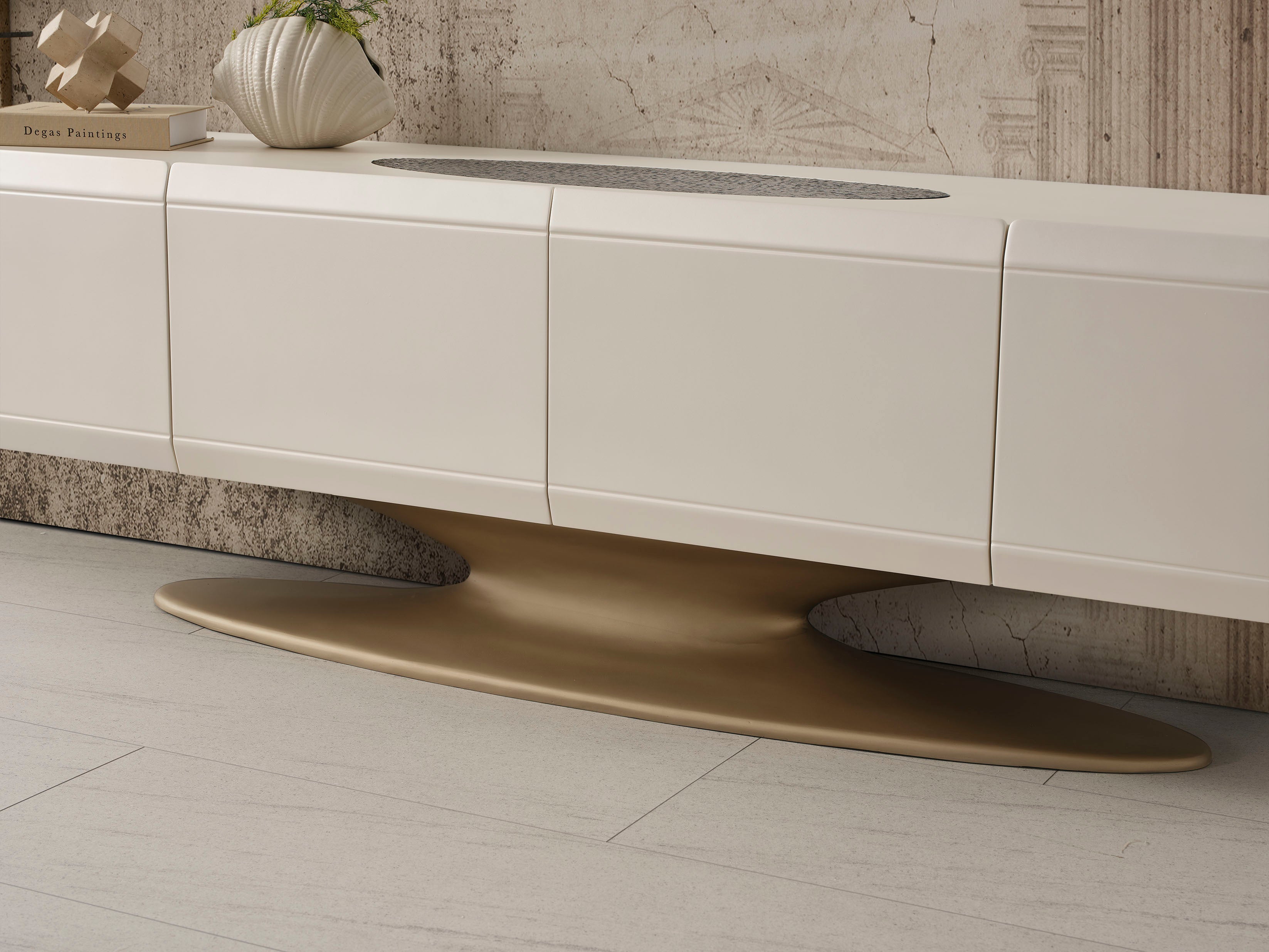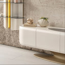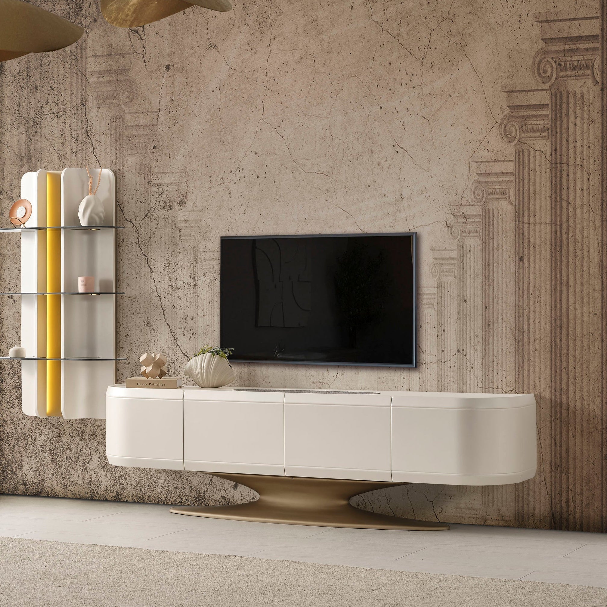 A Miami fehér TV-szekrény a kortárs design és az időtlen elegancia tökéletes ötvözete. Ívelt formái és fényes, hófehér felülete letisztult, mégis karakteres megjelenést biztosít. Az aranyszínű, szoborszerű talapzat finom luxust kölcsönöz, miközben könnyedséget ad a bútornak. A tágas tárolórekeszek praktikusan rejtik el a kábeleket és médiaeszközöket, így mindig rendezett marad a tér. A prémium anyaghasználat és precíz kidolgozás a Miami kollekció védjegye. Ideális választás modern nappalikba, ahol a stílus és funkcionalitás kéz a kézben jár. A fényes felületek visszaverik a természetes fényt, tágasabb érzetet keltve. A Miami TV-szekrény elegánsan emeli bármely enteriőr kifinomult hangulatát.