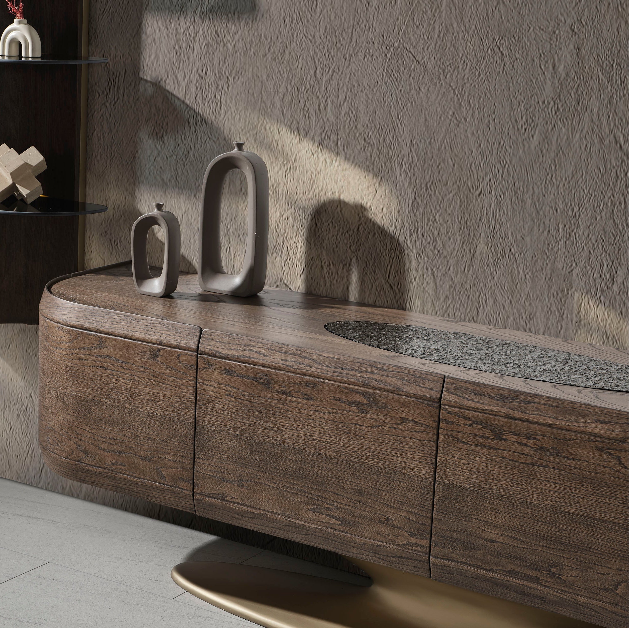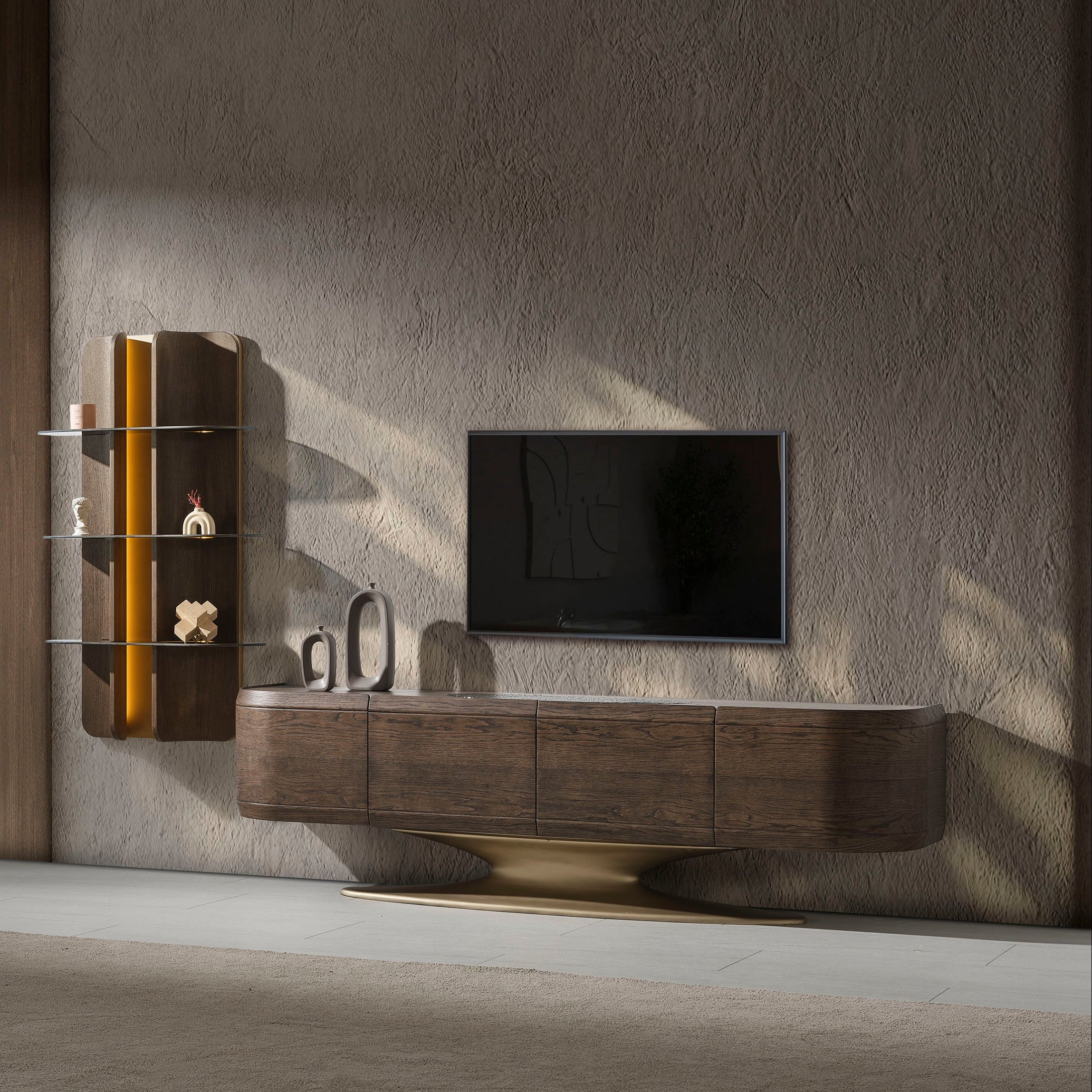 A Miami fehér TV-szekrény a kortárs design és az időtlen elegancia tökéletes ötvözete. Ívelt formái, fa felülete letisztult, mégis karakteres megjelenést biztosít. Az aranyszínű, szoborszerű talapzat finom luxust kölcsönöz, miközben könnyedséget ad a bútornak. A tágas tárolórekeszek praktikusan rejtik el a kábeleket és médiaeszközöket, így mindig rendezett marad a tér. A prémium anyaghasználat és precíz kidolgozás a Miami kollekció védjegye. Ideális választás modern nappalikba, ahol a stílus és funkcionalitás kéz a kézben jár. A Miami TV-szekrény elegánsan emeli bármely enteriőr kifinomult hangulatát.