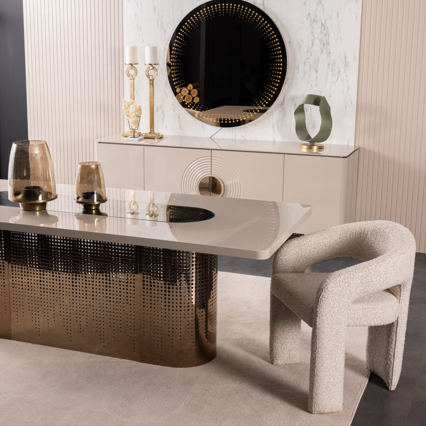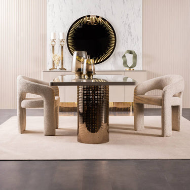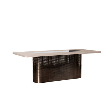 A Panamera étkezőasztal elegáns és modern kialakításával a luxus és funkcionalitás tökéletes egyensúlyát teremti meg. A bézs és arany színvilág kifinomult megjelenést kölcsönöz, amely bármilyen exkluzív enteriőrbe harmonikusan illeszkedik. A beépített világítás különleges atmoszférát teremt, kiemelve az asztal egyedi részleteit. Letisztult formavilága és prémium anyaghasználata garantálja a tartósságot és az időtálló eleganciát. Masszív szerkezete stabilitást biztosít, míg tágas asztallapja kényelmes helyet nyújt családi étkezésekhez és vendégfogadásokhoz.