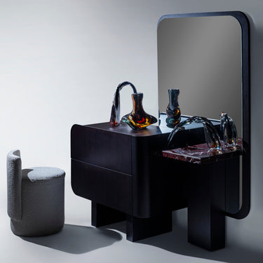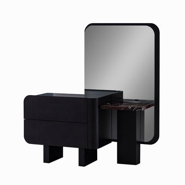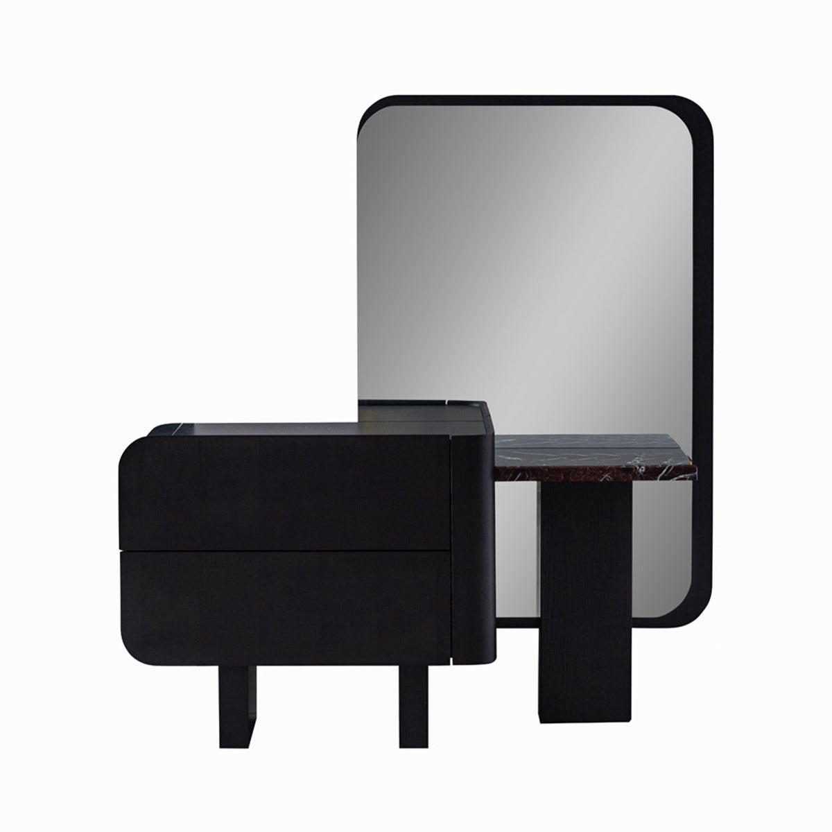A Portofino fésülködőasztal kifinomult formavilágot képvisel, amely egyszerre modern és elegánsan nőies. A sötét fa felület és a márványhatású asztallap egyedi, luxust sugárzó kompozíciót alkot. Tágas fiókrendszere kényelmes tárolást biztosít a mindennapi szépségápolási eszközöknek. A lekerekített tükör karakteres kiegészítő, amely vizuálisan lágyítja a bútor geometrikus formáit. A magas minőségű tükröződő felület torzításmentes és tartós használatra készült. A fésülködőasztal kompakt méreteinek köszönhetően kis és nagy hálószobákban egyaránt praktikus választás. A kollekció többi elemével összhangban elegáns, egységes belső teret teremt. A Portofino fésülködőasztal azoknak szól, akik szeretik a kifinomult, modern luxust.